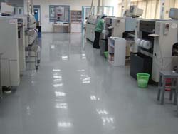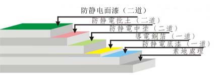 ①防水處理: 一樓地面需已做好防水處理; ②素地處理: 依素地狀況做好打磨、修補(bǔ)、除塵; ③防靜電底漆:采用滲透性及附著力特強(qiáng)防靜電環(huán)氧底漆滾涂一道,增強(qiáng)表面附著 力; ④防靜電中涂:防靜電中涂將環(huán)氧樹(shù)脂加入適量的石英砂,用鏝刀將其均勻涂布一至 二道; ⑤銅箔鋪設(shè): 導(dǎo)電銅箔采用井型鋪設(shè),有效排除累積之靜電,并做接地處理; ⑥防靜電批土:防靜電批土依實(shí)際需要施工數(shù)道,要求達(dá)到平整無(wú)孔洞,無(wú)批刀印及 砂磨印為準(zhǔn); ⑦防靜電面漆:防靜電面漆滾涂二道,其體積/表面電阻平均系數(shù)值1X10^6~1X10^9Ω,完工后整體地面光亮潔凈,顏色均一,無(wú)空鼓; ⑧施工完成: 24小時(shí)后方可上人,72小時(shí)后方可重壓。(25℃為準(zhǔn),低溫時(shí)開(kāi)放 時(shí)間需適度延長(zhǎng))