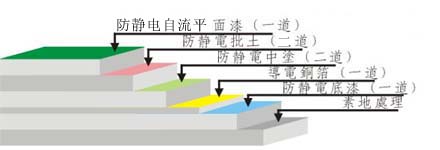 ①防水處理: 一樓地面需已做好防水處理; ②素地處理: 依素地狀況做好打磨、修補(bǔ)、除塵; ③防靜電底漆:采用滲透性及附著力特強(qiáng)防靜電環(huán)氧底漆滾涂一道,增強(qiáng)表面附著 力; ④防靜電中涂:防靜電中涂將環(huán)氧樹脂加入適量的石英砂,用鏝刀將其均勻涂布一至 二道; ⑤銅箔鋪設(shè): 導(dǎo)電銅箔采用井型鋪設(shè),有效排除累積之靜電,并做接地處理; ⑥防靜電批土:防靜電批土依實(shí)際需要施工數(shù)道,要求達(dá)到平整無(wú)孔洞,無(wú)批刀印及 砂磨印為準(zhǔn); ⑦防靜電面漆:防靜電面漆滾涂二道,其體積/表面電阻平均系數(shù)值1X10^6~1X10^9Ω,完工后整體地面光亮潔凈,顏色均一,無(wú)空鼓; ⑧施工完成: 24小時(shí)后方可上人,72小時(shí)后方可重壓。(25℃為準(zhǔn),低溫時(shí)開放 時(shí)間需適度延長(zhǎng))