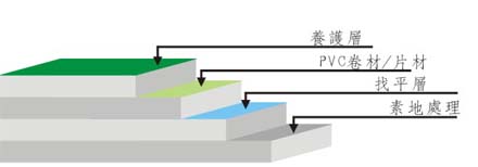 ①防水處理:一樓地面需做好防水處理; ②素地處理:打磨、清除顆粒、灰塵等雜物; ③找平層:滾一道水性封閉底漆,增強附著力,干燥后鏝一道自流平水泥,找平地面; ④貼PVC卷材/片材:把膠粘劑刷涂在PVC卷材/片材上,遵守晾置時間,進(jìn)行加壓膠接,然后處理接縫處,用膠焊機(jī)把焊條焊好接縫,并處理; ⑤養(yǎng)護(hù)層:清掃干凈,用水性蠟均勻涂敷在產(chǎn)品表面。